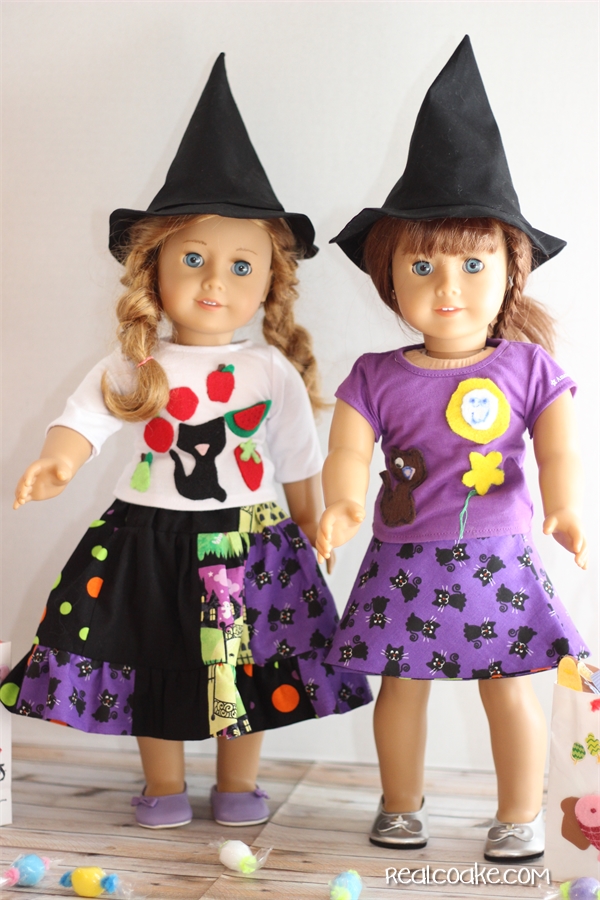 Now our dolls are set for Halloween. They have witch hats, trick or treat bags and cute skirts. In case you are wondering, my girls made the shirts for their dolls from the AG Doll Tees Felt Fashions book