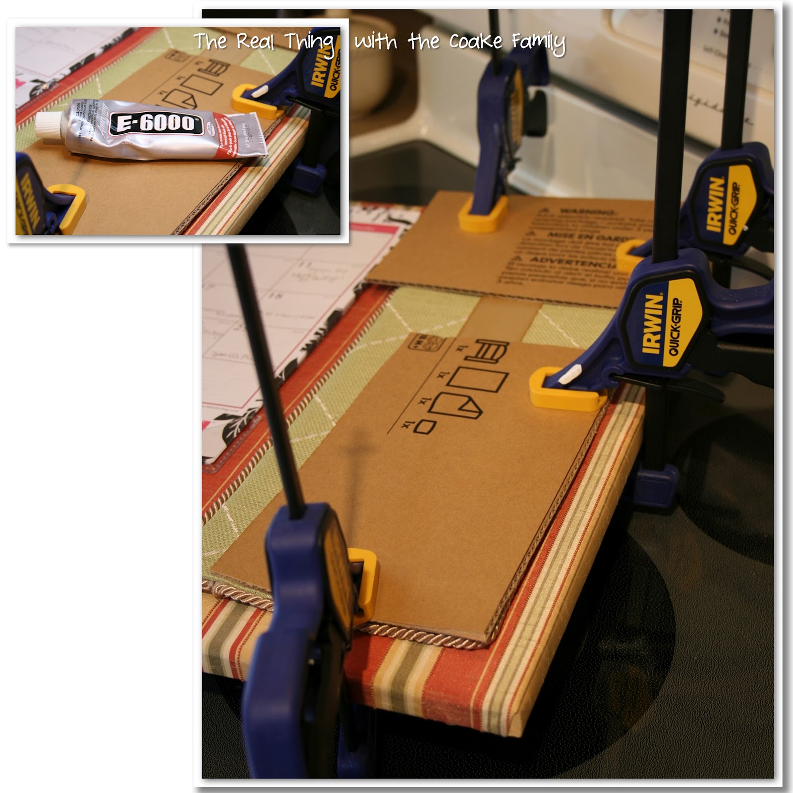 I needed to attach the menu planning portion to the canvas for the middle section. Once again, it was time to use E6000 and Mr. T’s handy clamps
