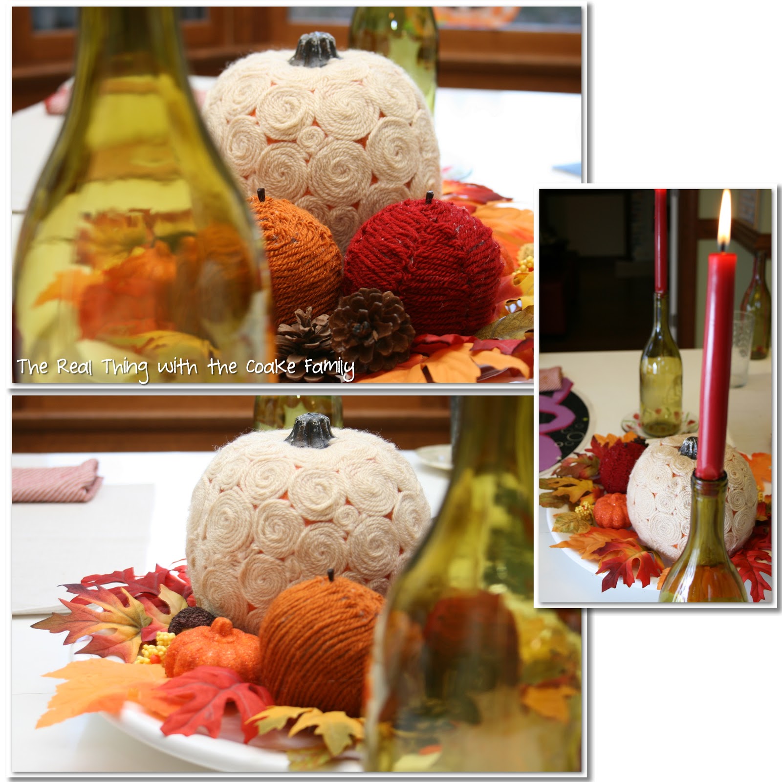 See the hints of Halloween? The black feather boa as well as the pumpkin and spider web etched on the wine bottle candle holders. You can read the whole post about this version: Fall Centerpiece.