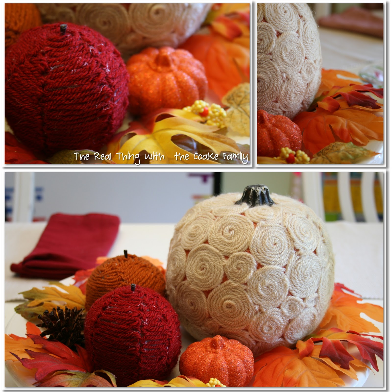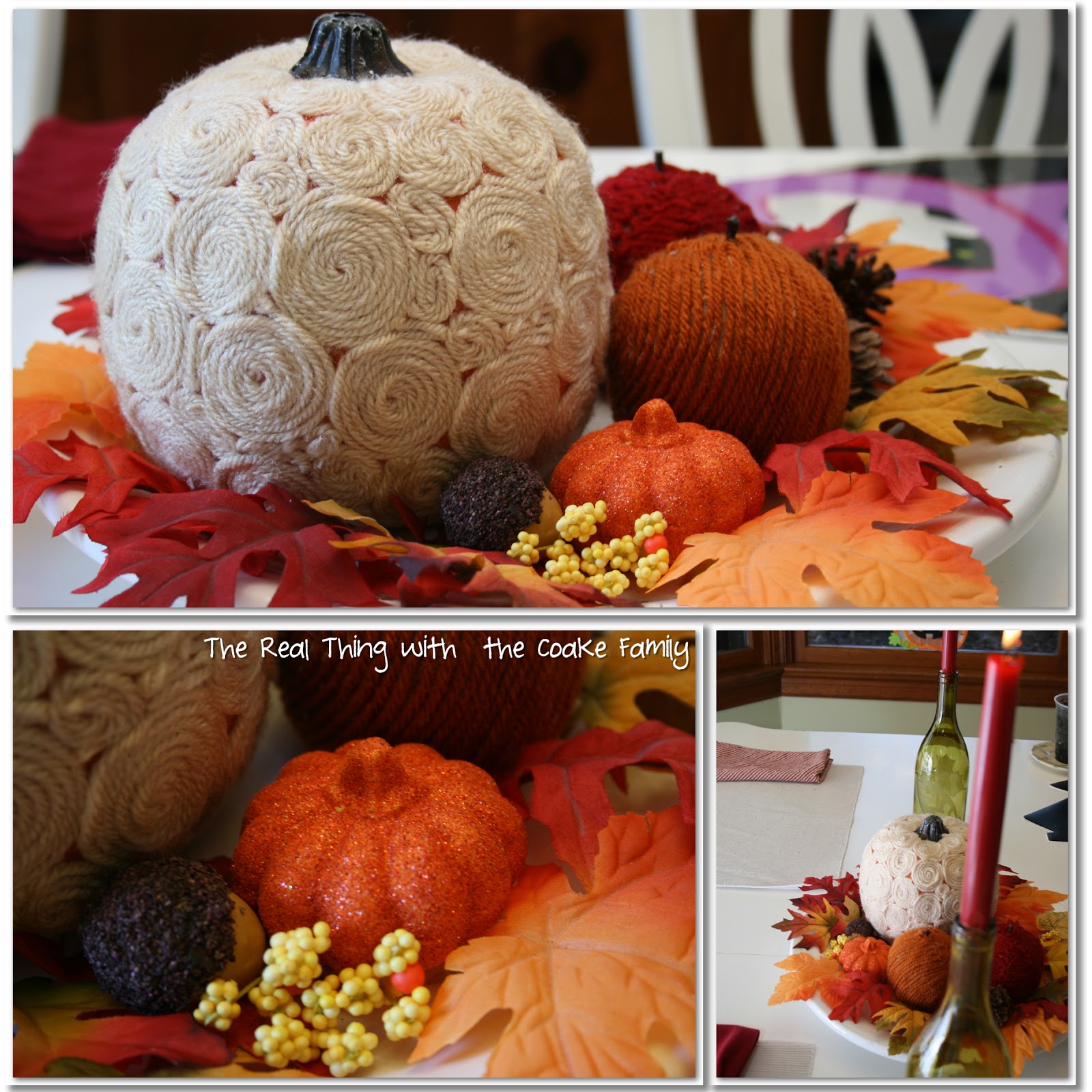 Above is the changed Fall centerpiece. I showed you how I made the Swirly Wirly ~ Spiral Rosette Yarn Wrapped Pumpkin that is the start of the show, but before we get too far, let me show you the original centerpiece.