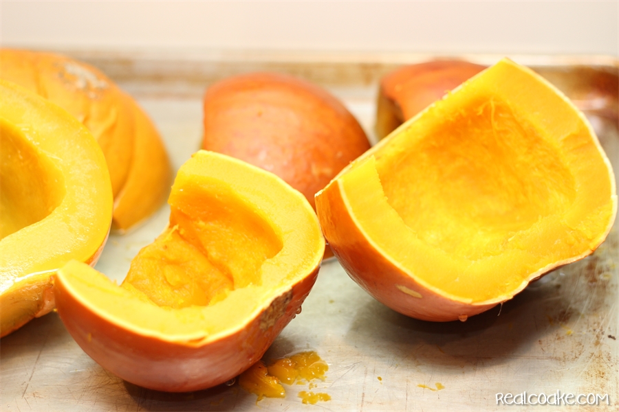 After cracking open cutting open your pumpkin, fill your sheet pan with about 1/4″ of water. Place your pumpkins cut side down on a sheet pan. Bake the pumpkins at 350 degrees for 45 – 60 minutes. You will know they are done by pushing on the skin (of a normal not hard shell). If you can easily push through the skin, the pumpkin is done. For the hard shell pumpkins, I had to turn them over and check if the flesh was soft. Even after cooking for nearly an hour, the hard shell was still hard as a rock.