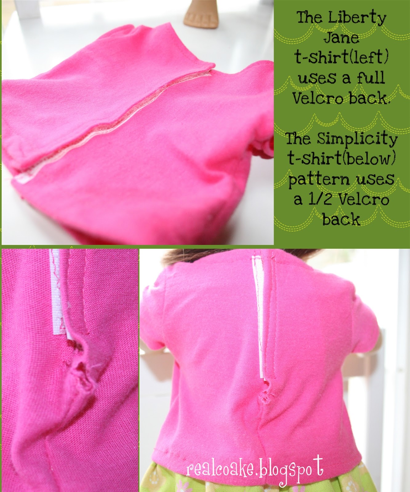 Looking at the back of the shirts, there is a problem. The Liberty Jane t-shirt uses a piece of Velcro along the full opening in the back while the Simplicity t-shirt said to sew the shirt 1/2 way and use Velcro only at the top. As you can see from the pictures, this method does not work for my Pumpkin. The t-shirt had this rip in it after only 1 day. I think she only put it on and off once or twice. It was just too hard for her to do it carefully and if you have kids, you know that finicky things don’t last long. The full Velcro just works so much better and easier for kids. That must be why the Official American Girl items like this all use a full Velcro back opening!