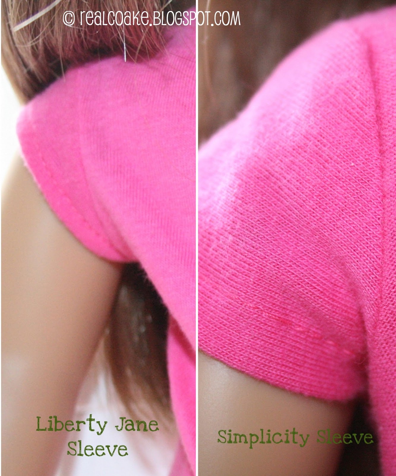 Can you see the differences between the two shirts pictured above. The simplicity pattern has more substantial sleeves as well as interfacing near the collar. The Liberty Jane t-shirt looks more form fitting (that sounds weird to write about a doll t-shirt) and narrower hems, which look a little more t-shirt like to me.