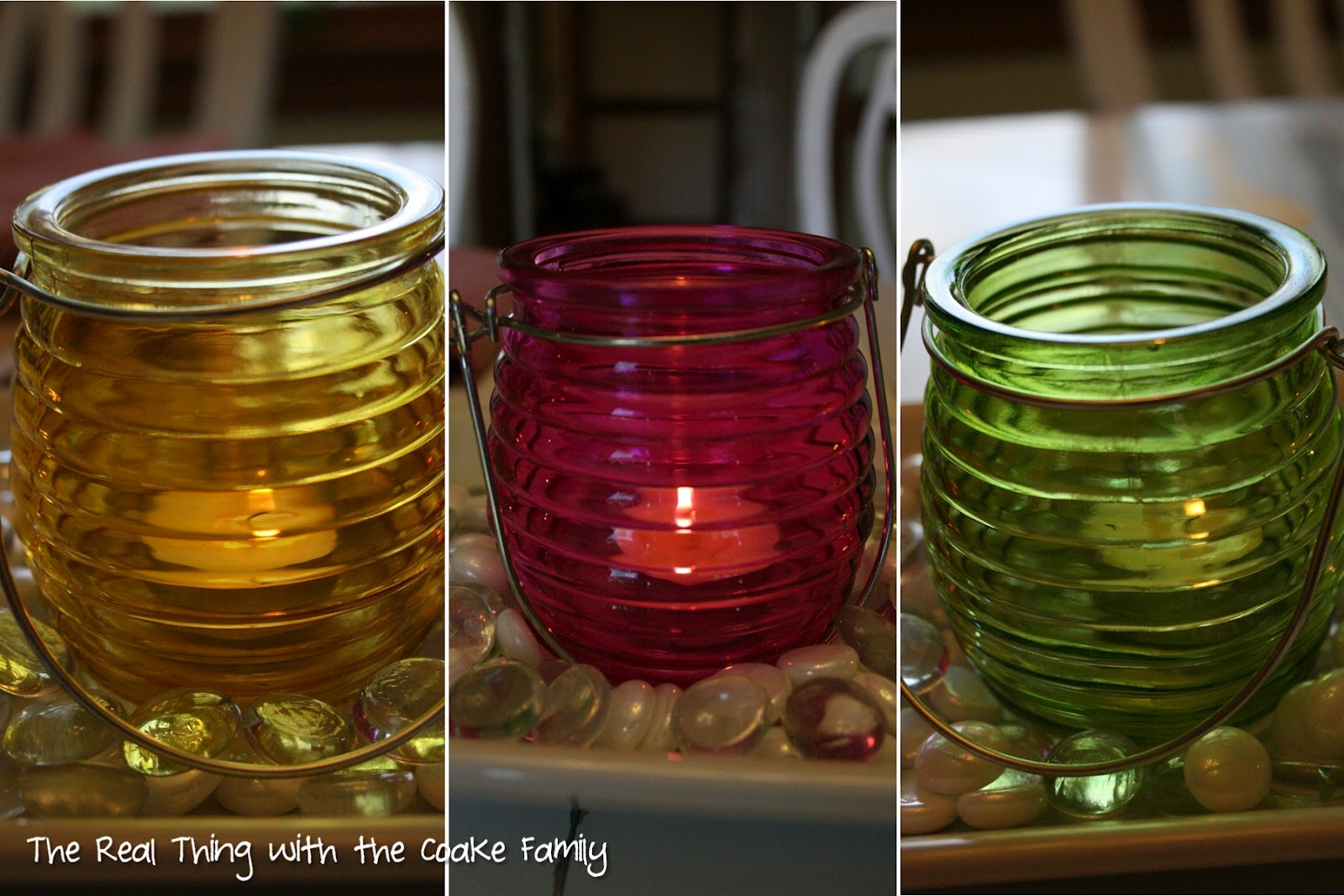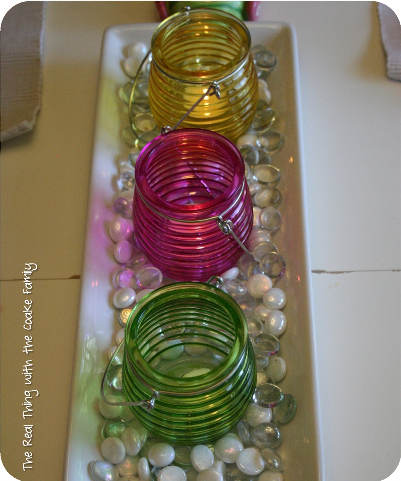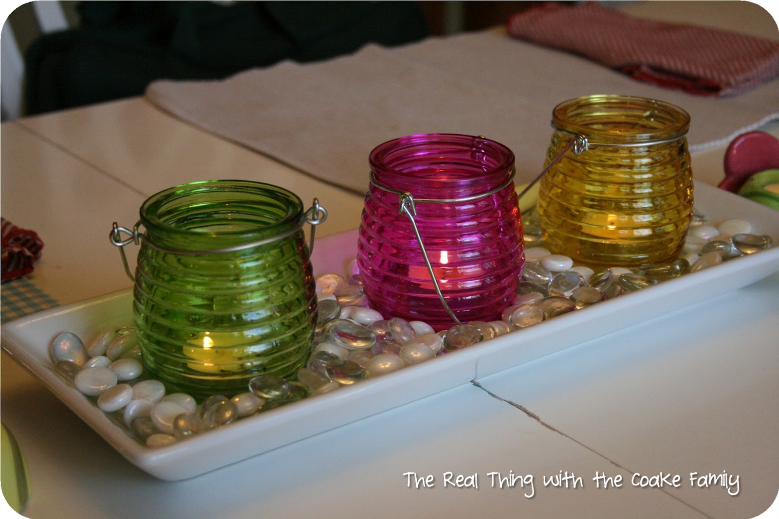 To make this centerpiece, I used my Pampered Chef serving tray. I tried to find it on their website, but they must not make it anymore. I think it was from the Simple Additions collection and it has a bamboo tray with handles that I can use with it as well. I added some white and clear glass gems as well as the votive holders. The final piece was to add the tea lights.