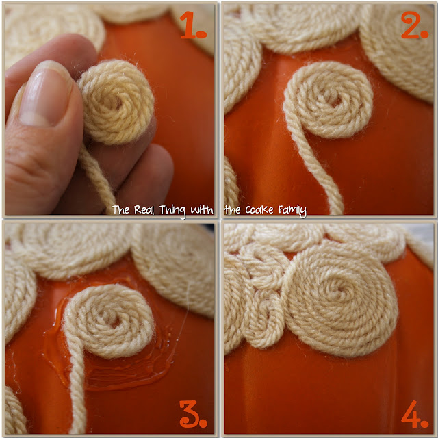 - Next up, put hot glue on the pumpkin a bit away from the nearest rosette and in about the size of the current swirl of yarn.