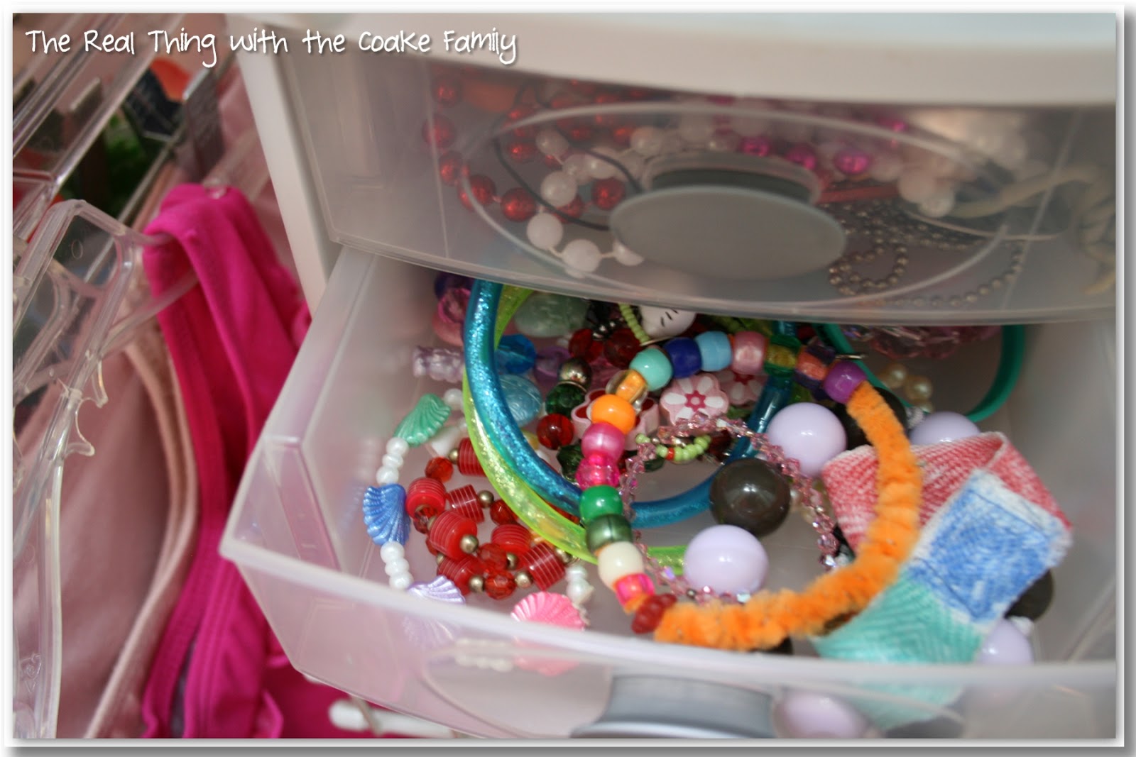 On the lower shelves are the more frequently played with things. I put the jewelry on this shelf right by the dress up things. That way it makes a dress up area.